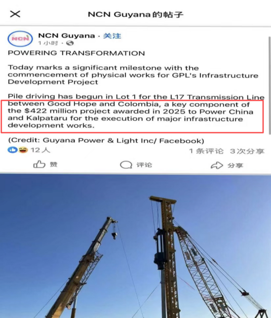 On the afternoon of October 11 local time in Georgetown, Guyana, at the Z7 transmission line construction site between Good Hope and Colombia, the final hammer strike marked the successful installation of the first pile foundation for the Guyana GPL053 Power Transmission and Transformation EPC Turnkey Project, undertaken by Jiangxi Electric Power Construction Corporation Ltd. (JEPCC). This milestone signifies the official commencement of the project’s main construction phase. The smooth placement of this first pile is a testament to the collaborative efforts and professional execution of the project team, laying a solid foundation for subsequent work. It is reported that the Guyana GPL053 Power Transmission and Transformation EPC Turnkey Project, as a key energy infrastructure initiative in the region, will significantly advance the Guyana’s modernization of its power grid system. It aims to meet growing electricity demands and provide a stable energy supply to support rapid regional economic development. Guyana’s National Communications Network (NCN) promptly covered this milestone event on local media platforms, stating that “this marks a critical step in the physical launch of GPL’s infrastructure development project.” JEPCC will continue to leverage its professional expertise to advance the project with high standards, contributing Chinese wisdom and strength to the energy sector development in the region. Guyana’s NCN posts an article on Facebook Group photo of the project team Pile foundation construction  | |